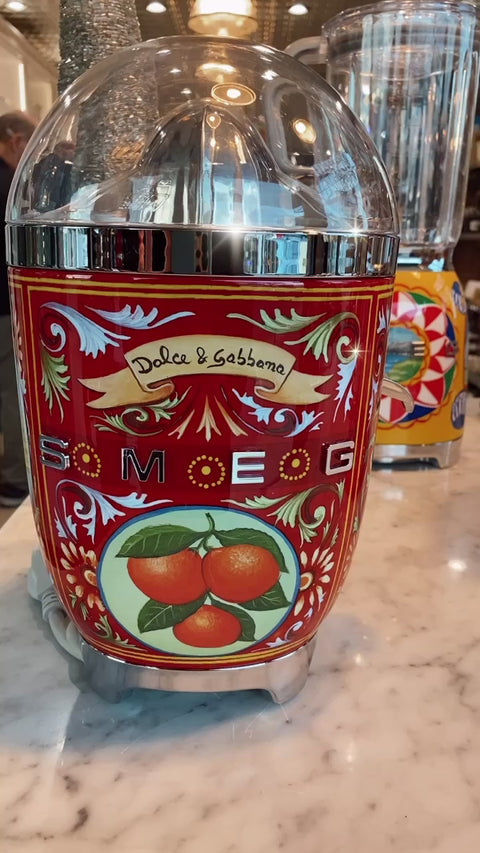 The Smeg Dolce&Gabbana Blender is a collaboration between the Italian company SMEG and the fashion designer Dolce&Gabbana. It is a retro-style blender with a glossy finish that is made in Italy. It has a 6-cup Tritan BPA-free pitcher, four speeds, and three preset programs. It also has a transparent lid with a built-in measuring cup, anti-slip feet, a 1-meter cord, and a built-in cord wrap