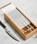 MiyabiMIYABI strives for perfection with Kaizen - Japanese for "improvement" or "change for the better." This line of knives combines the best hardening technology with the artistry of traditional Japanese craftsmanship. The resilient core of VG10 super steel is protected by a stunning 64-layer flower Damascus pattern.The CRYODUR blades feature exceptional sharpness and durability thanks to their innovative, icehardening treatment. Then, artisans hand-hone the blades with the historic Honbazuke method. This attention to detail translates into precision cutting for MIYABI Kaizen users.The blade is balanced by a refined D-shaped handle made of black linen Micarta. With a wood-like texture, the comfortable handle won't slip from your hand and acts as a moisture repellant. Handcrafted in Seki, Japan.